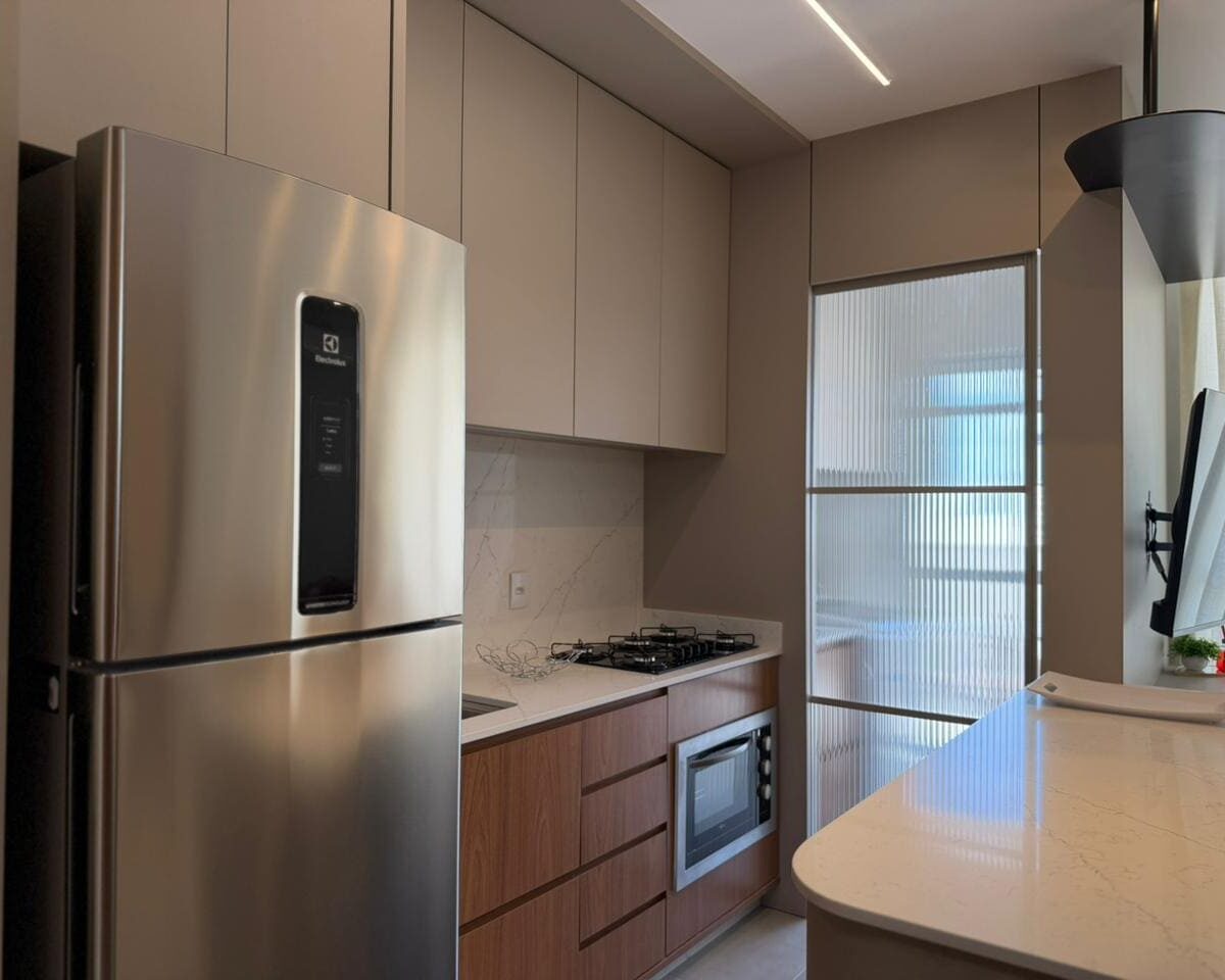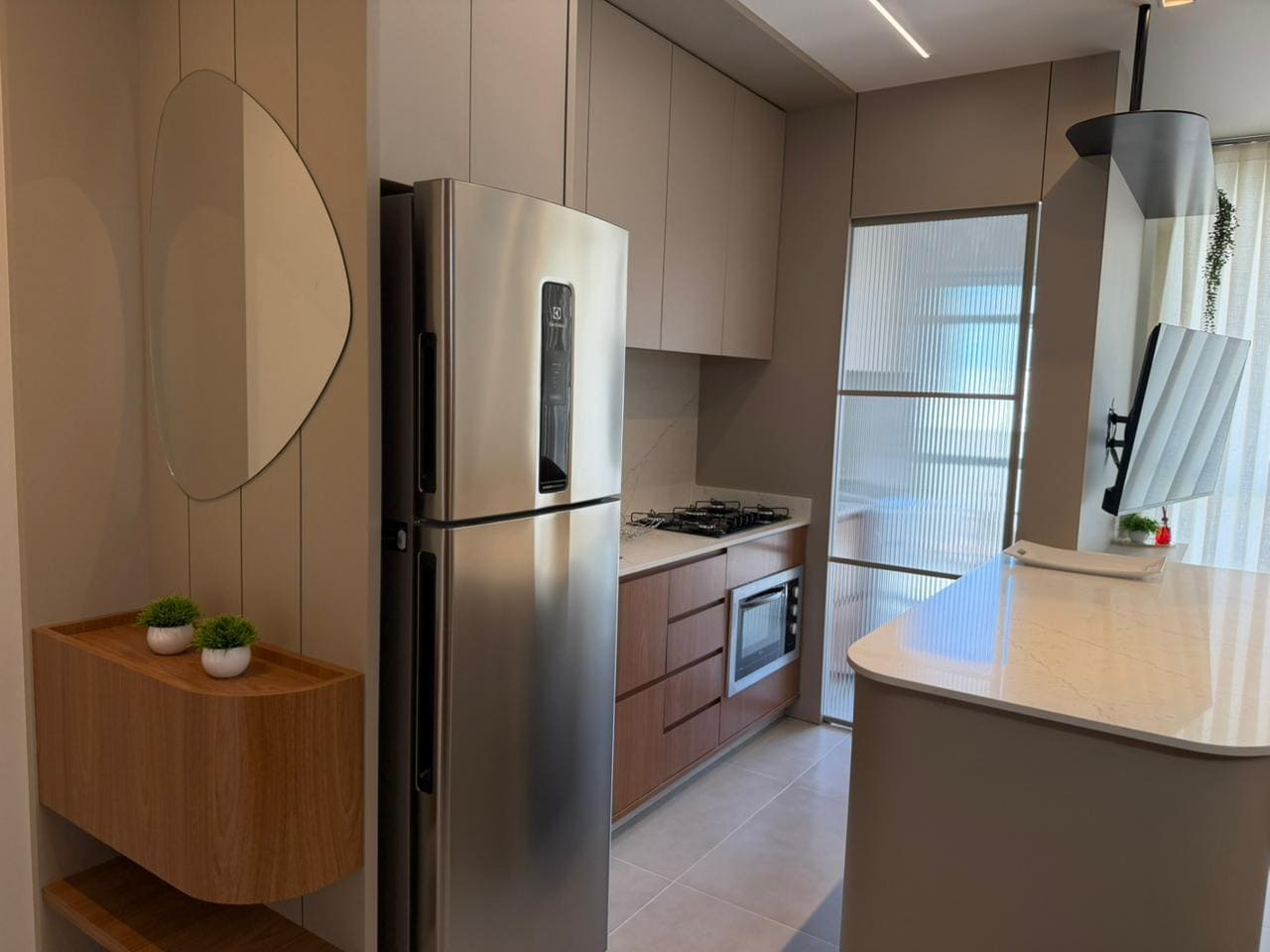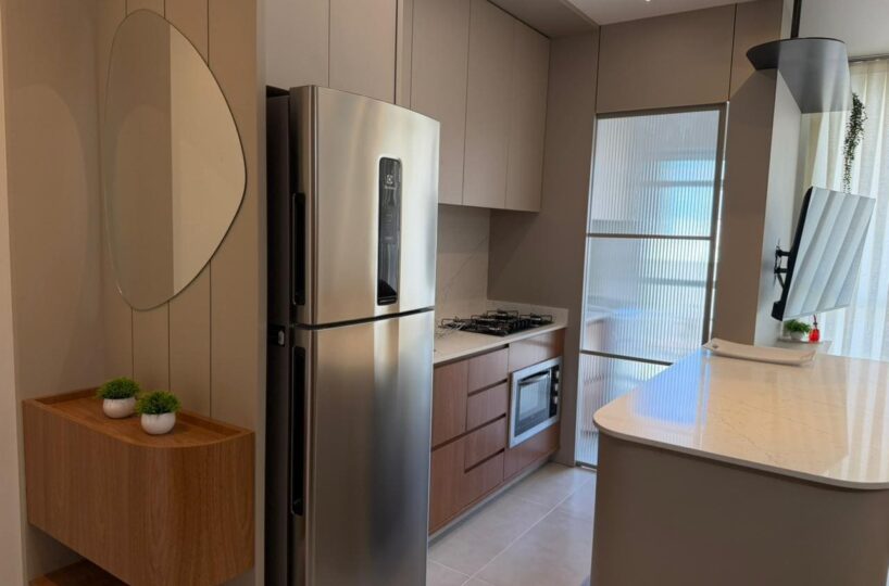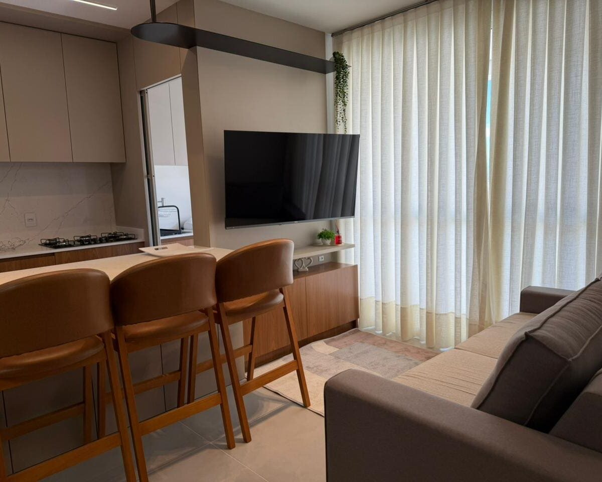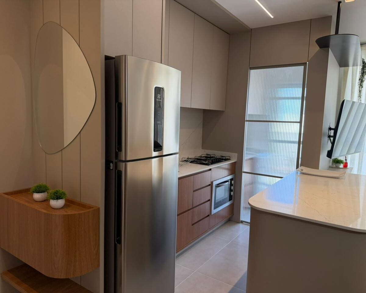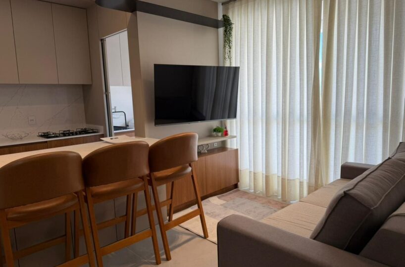 Imóvel dispõe de 02 dormitórios, sendo um deles suíte, localizado no terceiro pavimento, os 02 dormitórios possuem climatização com ar condicionado Split, sala e cozinha integrada, banheiro social, ampla sacada com churrasqueira a carvão e lavanderia.