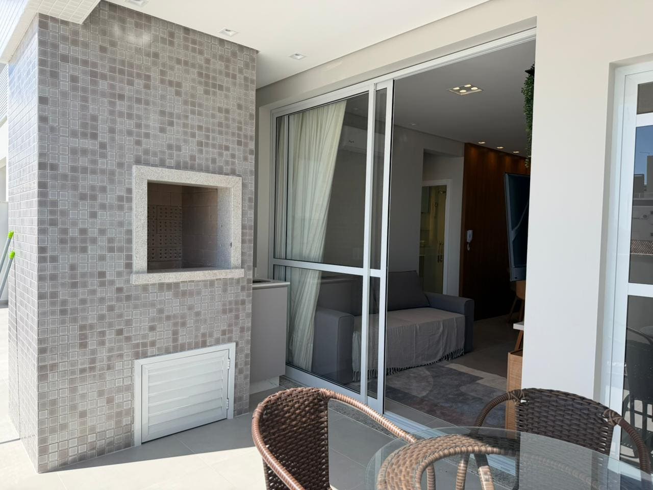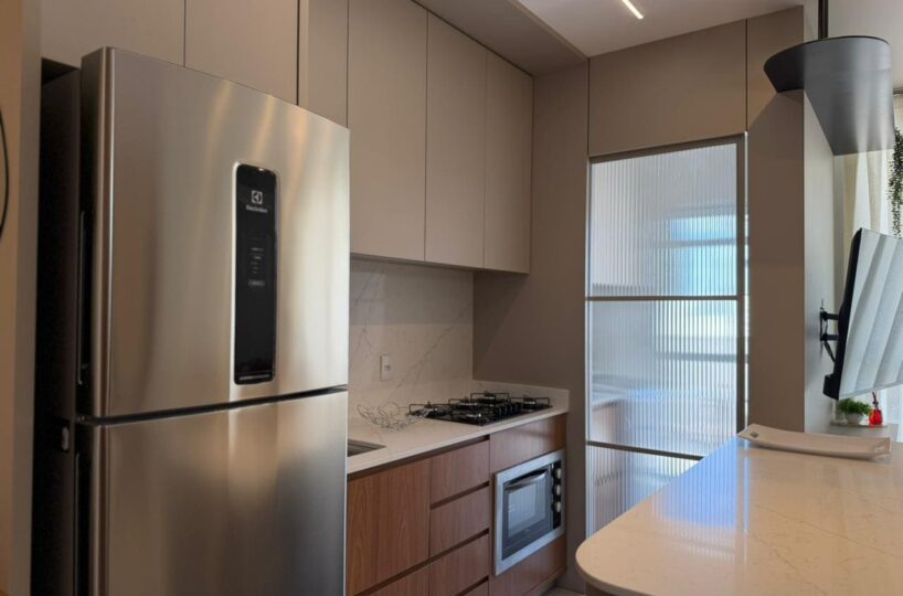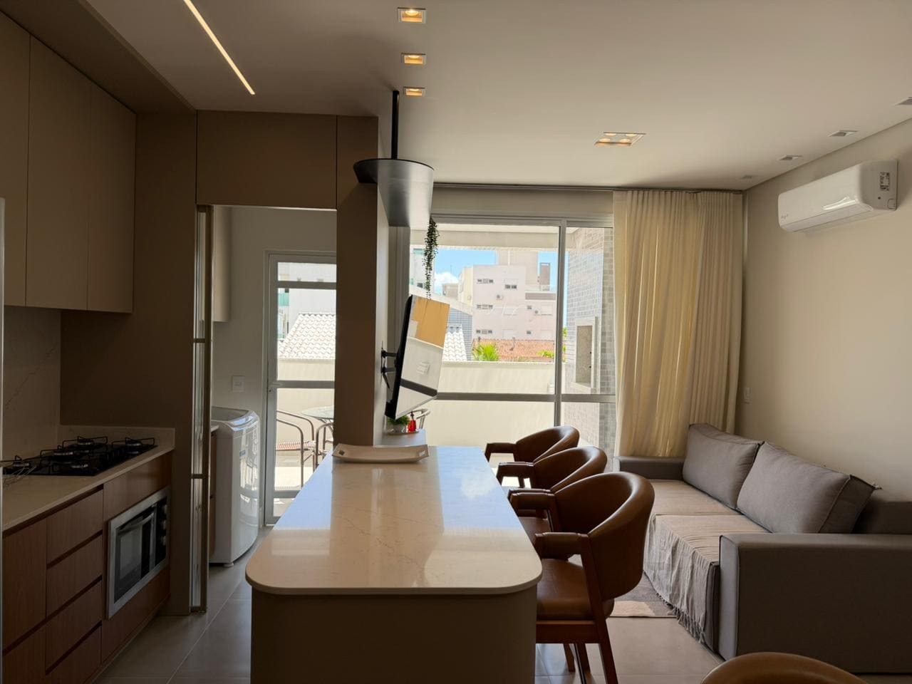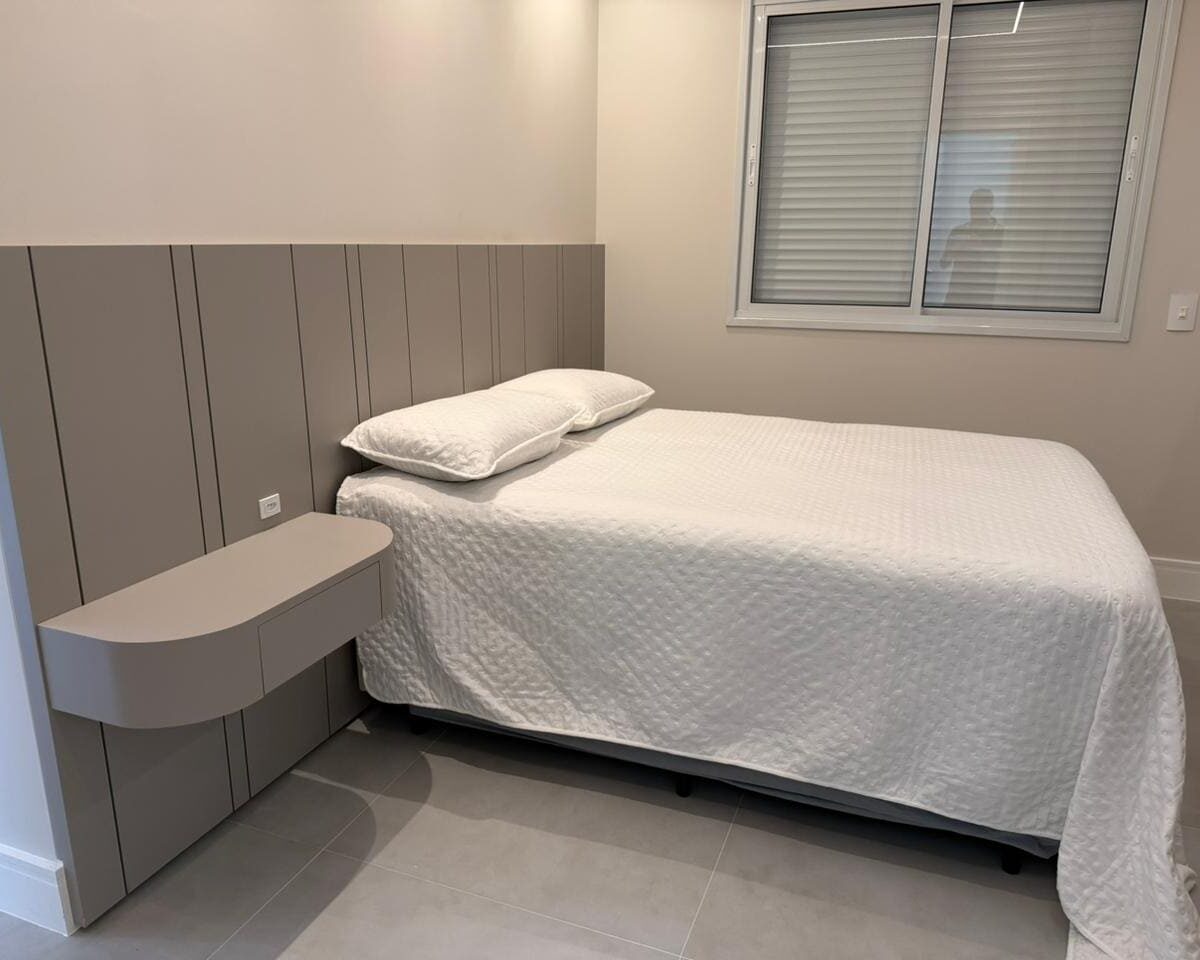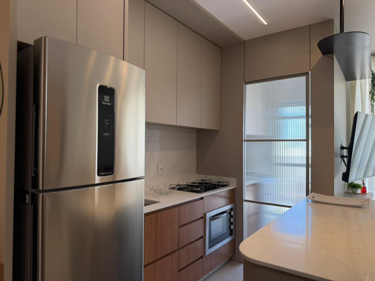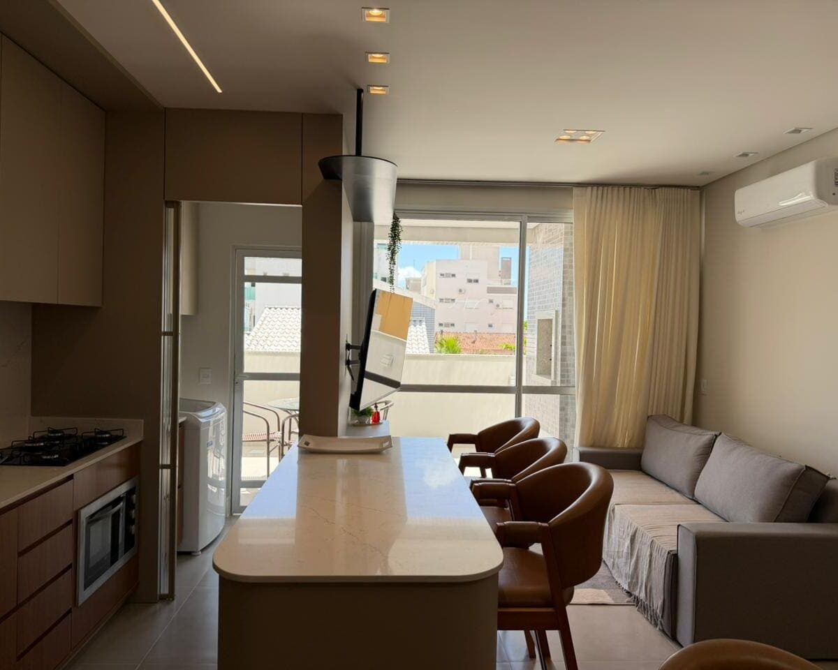 Imóvel dispõe de 02 dormitórios, sendo um deles suíte, localizado no terceiro pavimento, os 02 dormitórios possuem climatização com ar condicionado Split, sala e cozinha integrada, banheiro social, ampla sacada com churrasqueira a carvão e lavanderia.