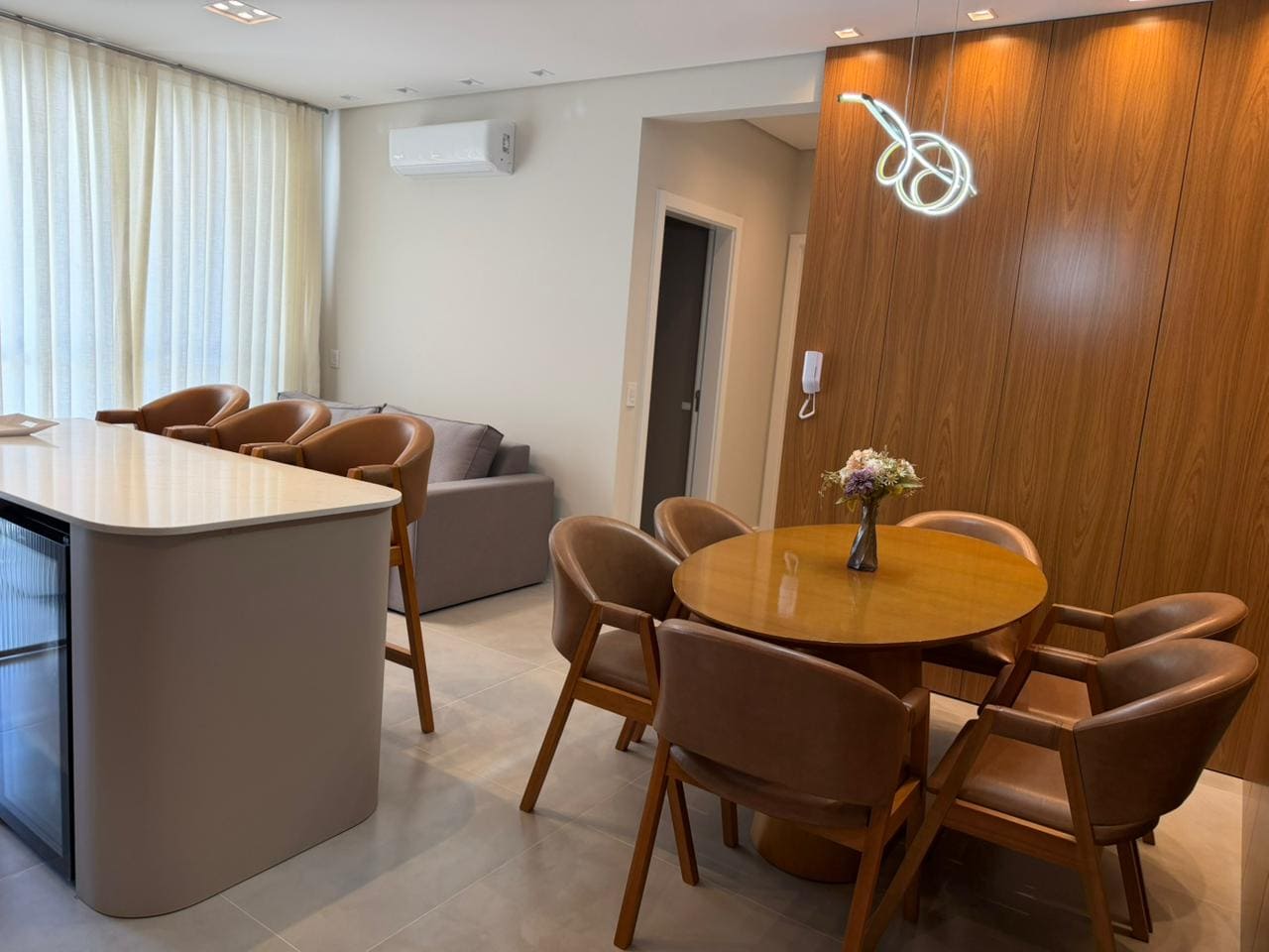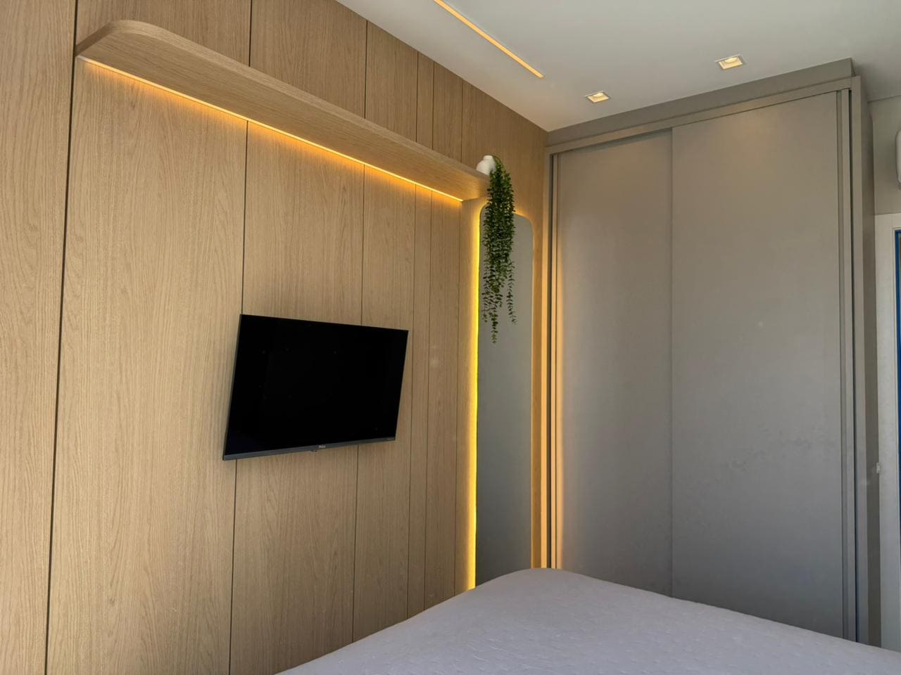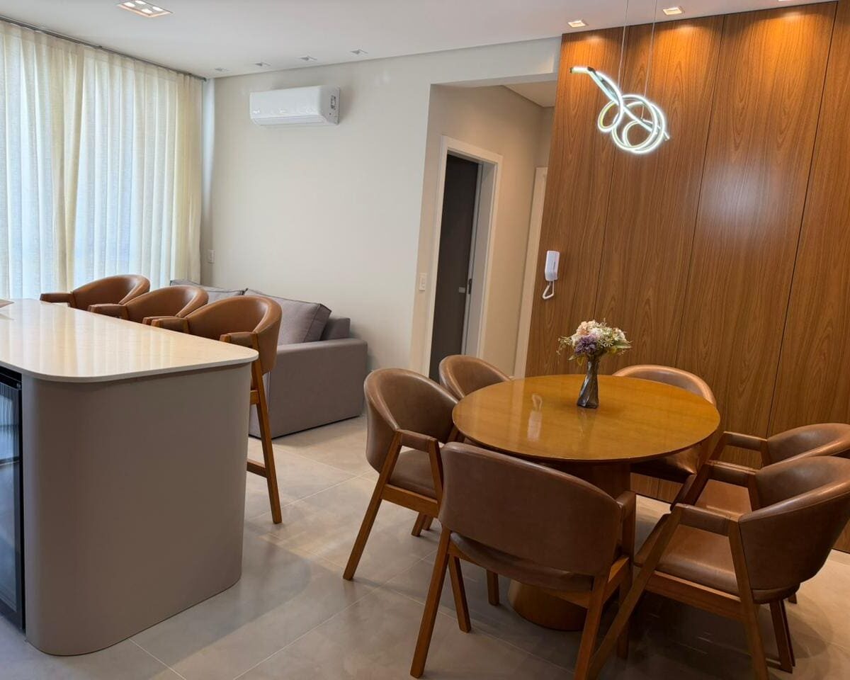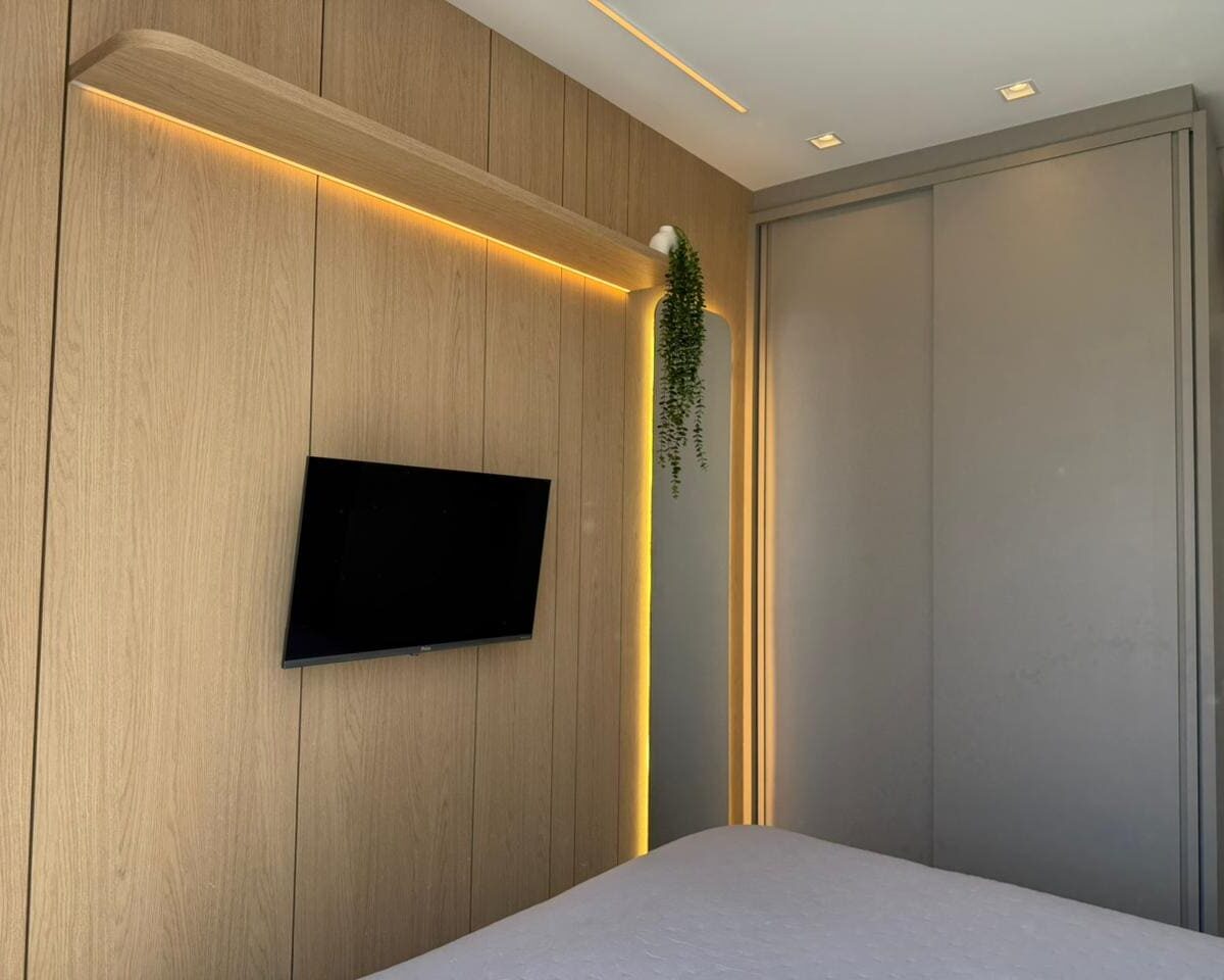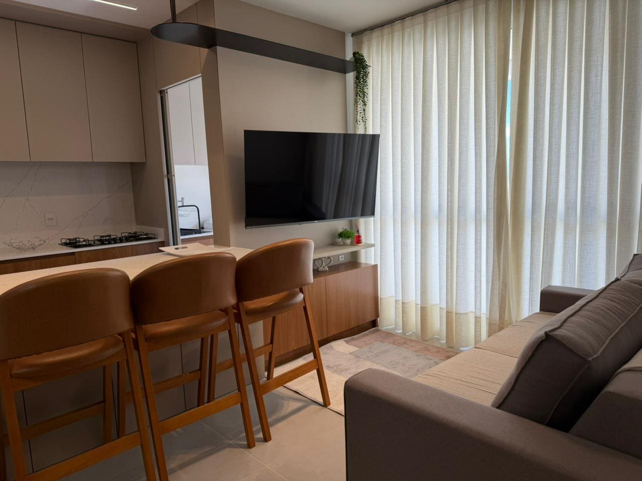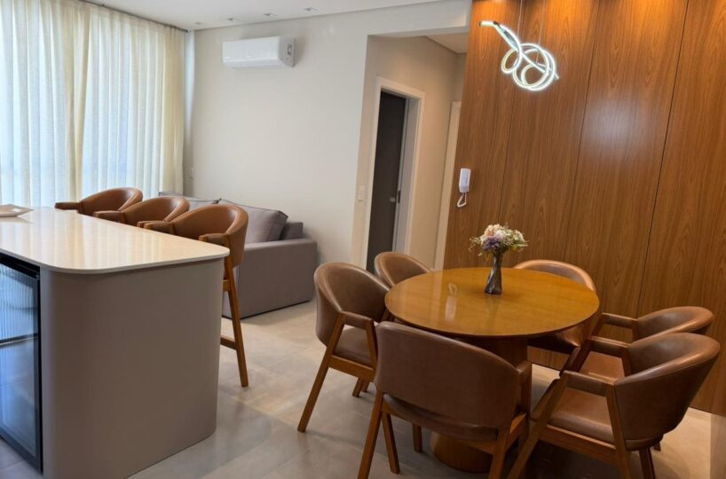 Imóvel dispõe de 02 dormitórios, sendo um deles suíte, localizado no terceiro pavimento, os 02 dormitórios possuem climatização com ar condicionado Split, sala e cozinha integrada, banheiro social, ampla sacada com churrasqueira a carvão e lavanderia.