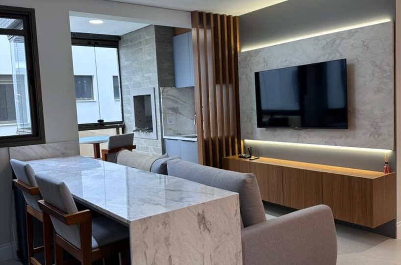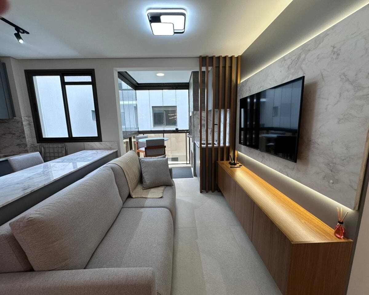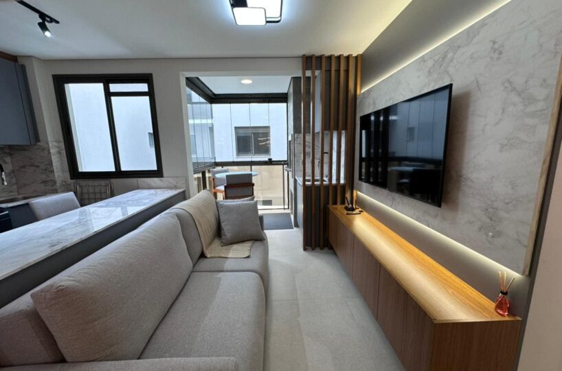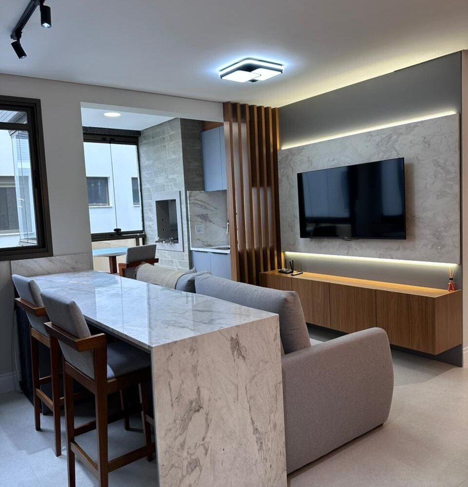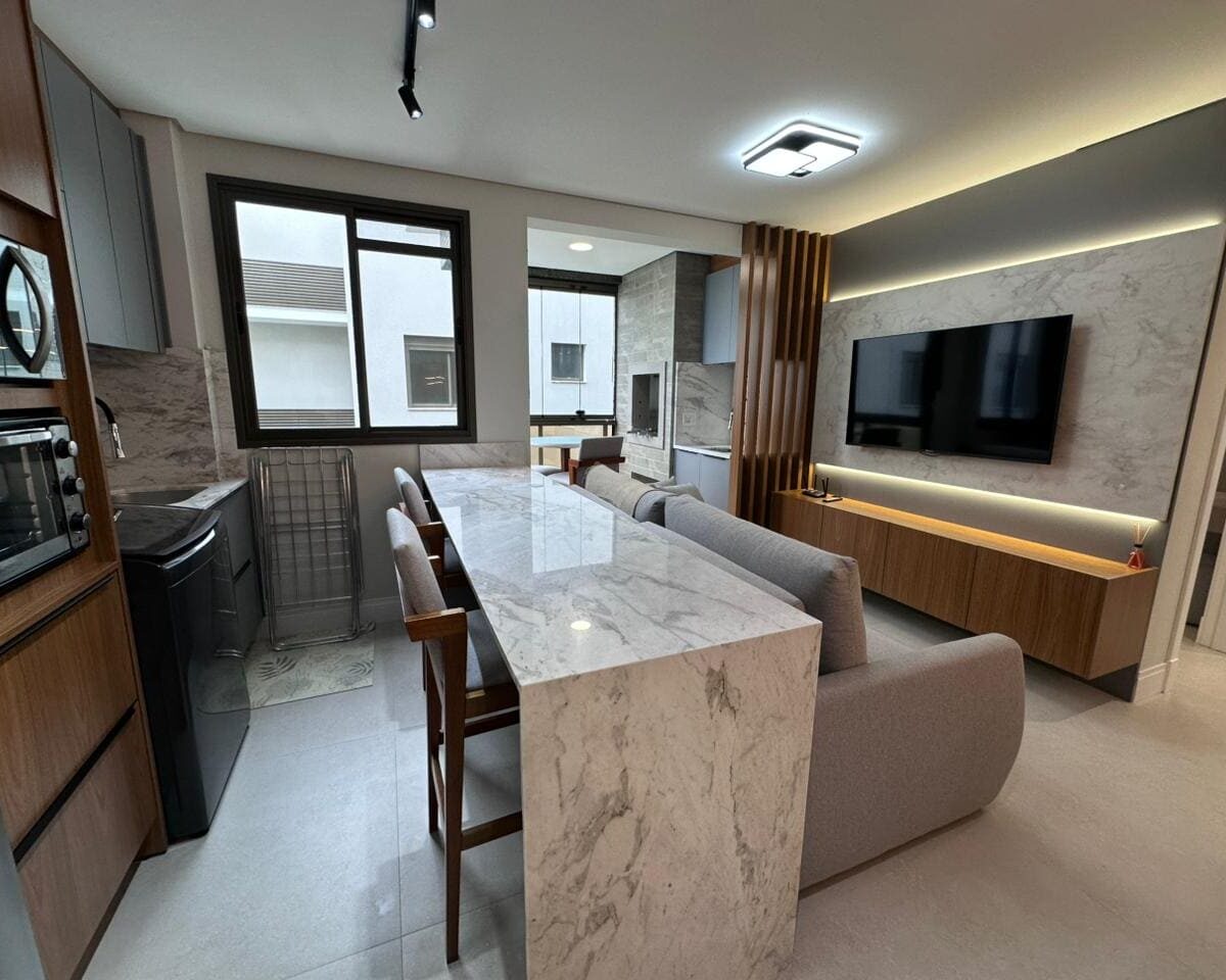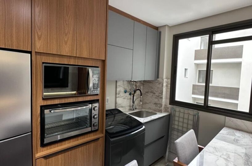 Imóvel dispõe de 02 dormitórios, sendo um deles suíte, localizado no terceiro pavimento, os 02 dormitórios possuem climatização com ar condicionado Split, sala e cozinha integrada, banheiro social, ampla sacada com churrasqueira a carvão e lavanderia.