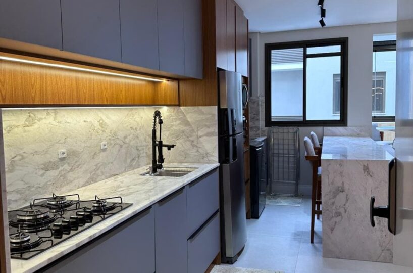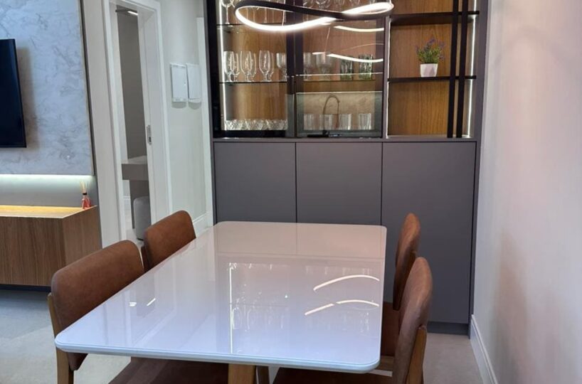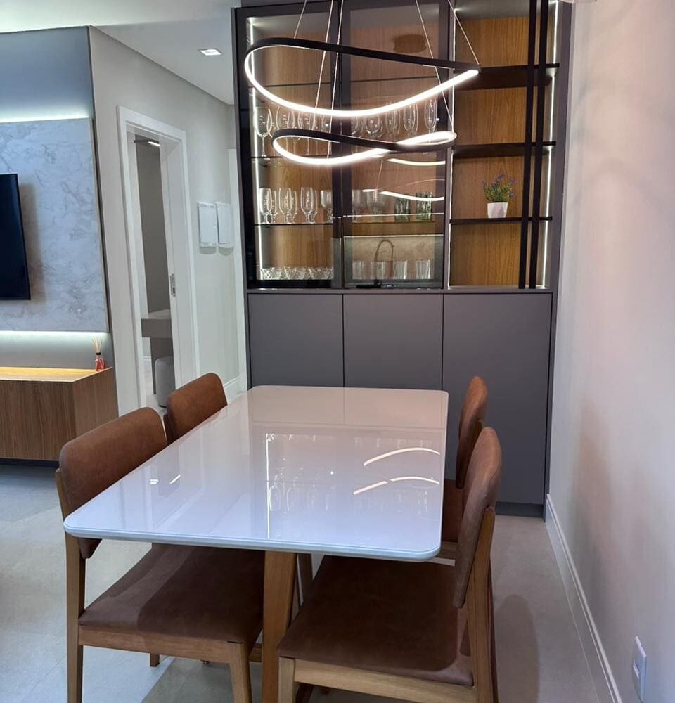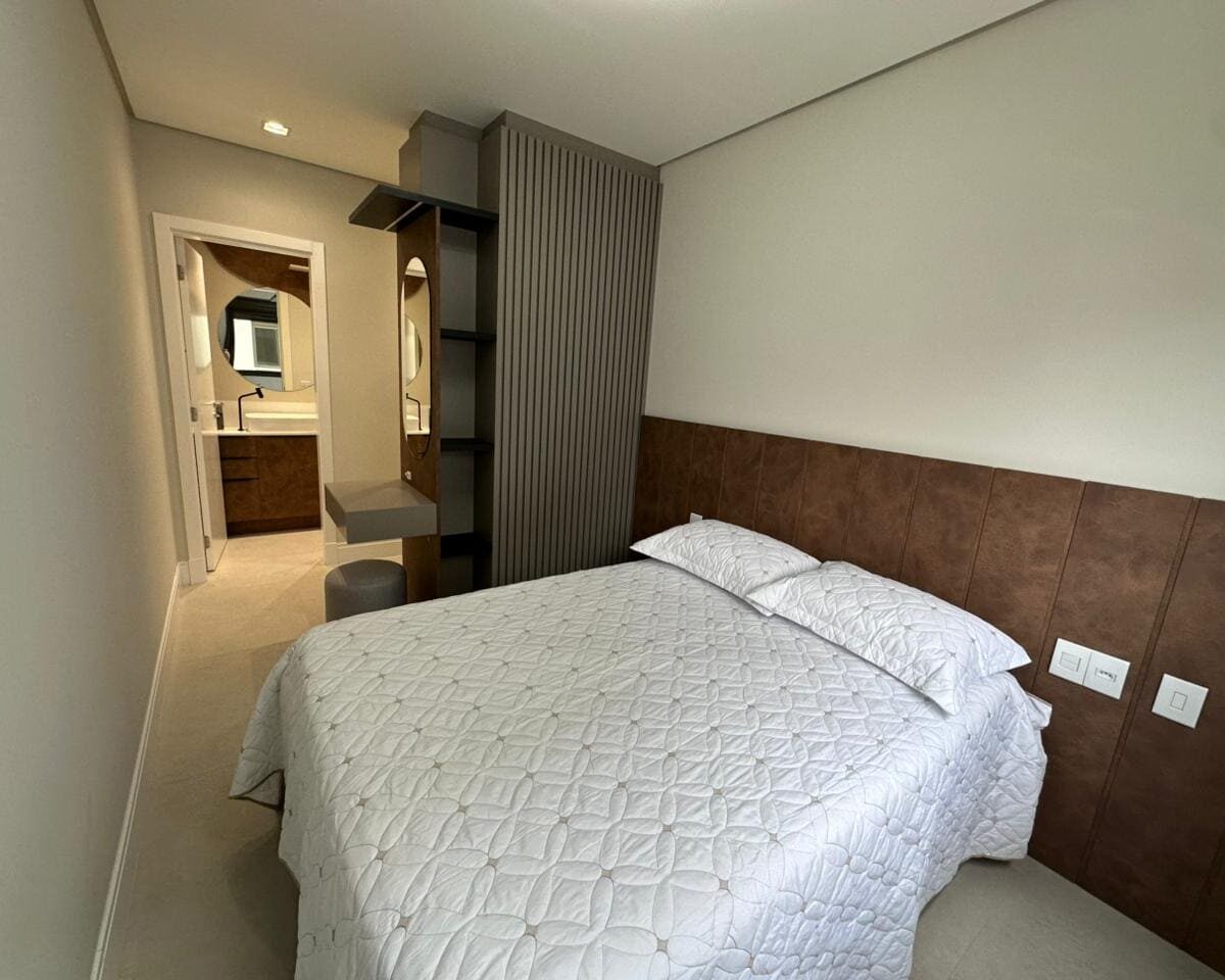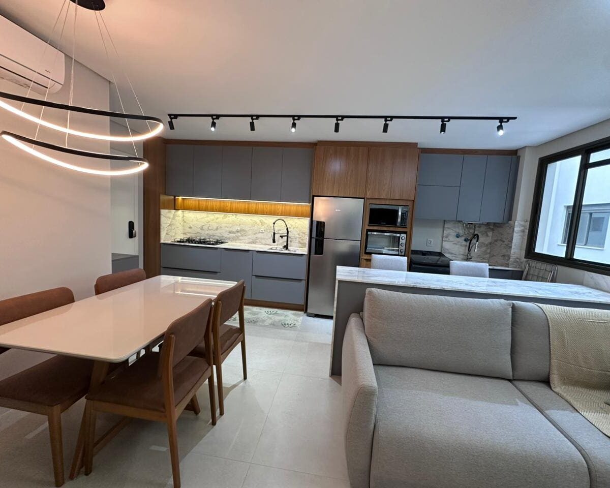 Imóvel dispõe de 02 dormitórios, sendo um deles suíte, localizado no terceiro pavimento, os 02 dormitórios possuem climatização com ar condicionado Split, sala e cozinha integrada, banheiro social, ampla sacada com churrasqueira a carvão e lavanderia.