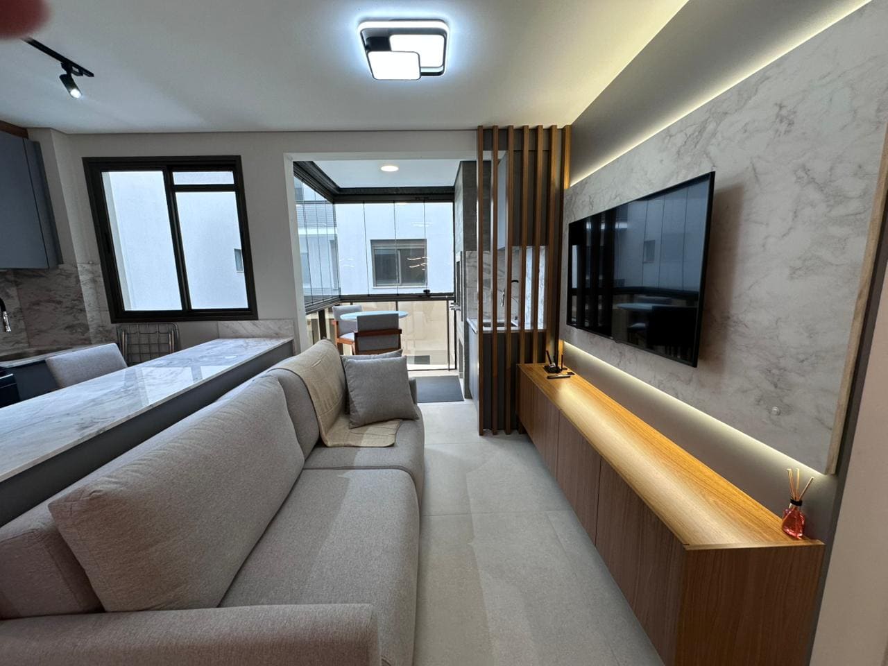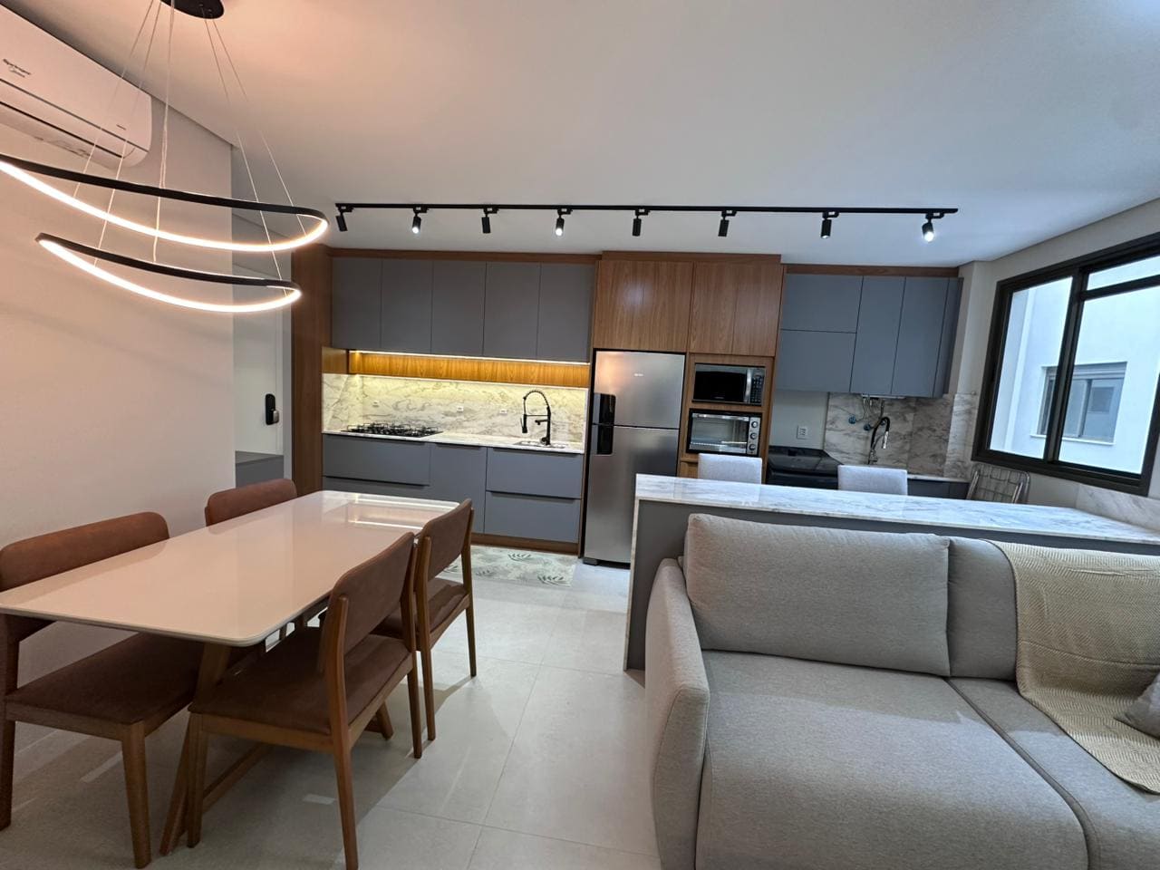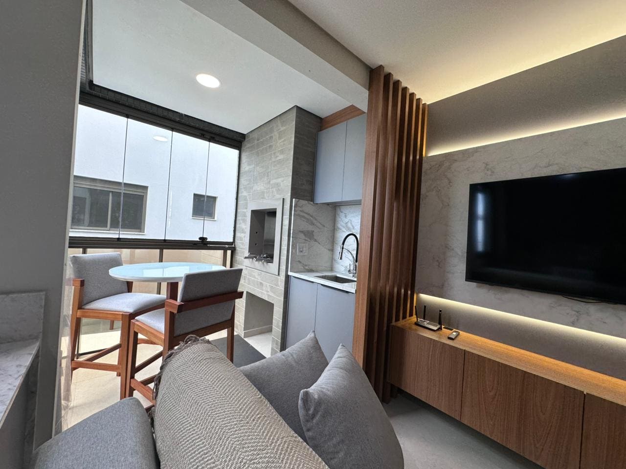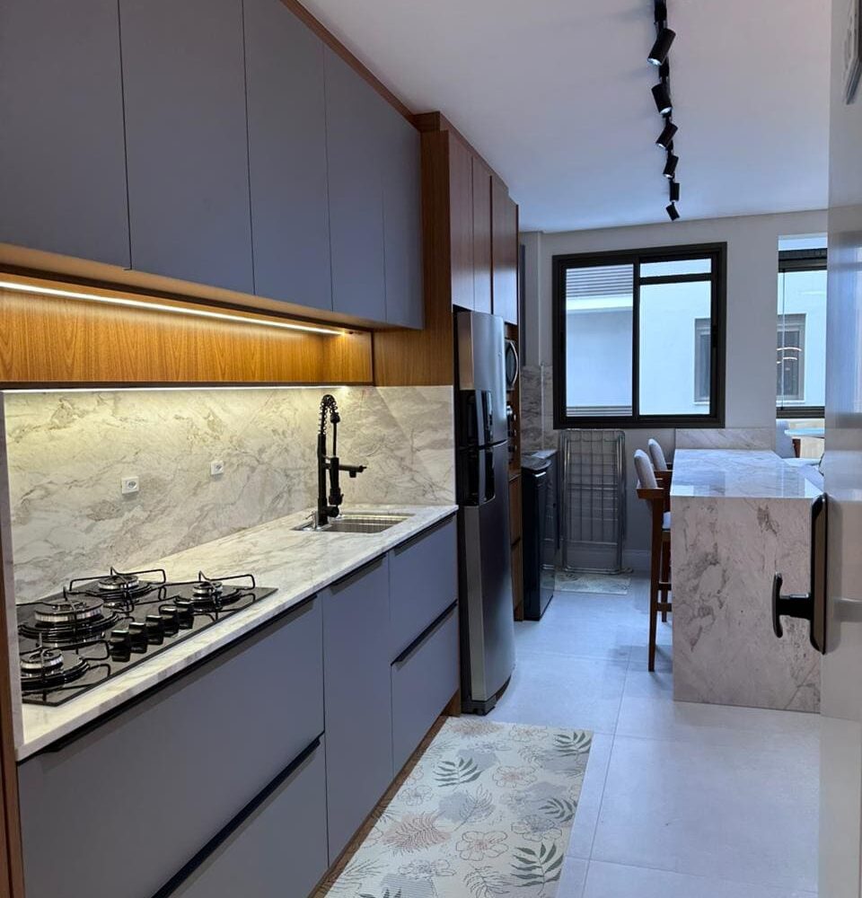 Imóvel dispõe de 02 dormitórios, sendo um deles suíte, localizado no terceiro pavimento, os 02 dormitórios possuem climatização com ar condicionado Split, sala e cozinha integrada, banheiro social, ampla sacada com churrasqueira a carvão e lavanderia.