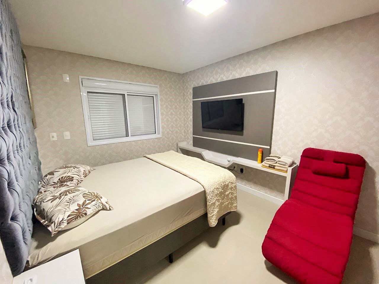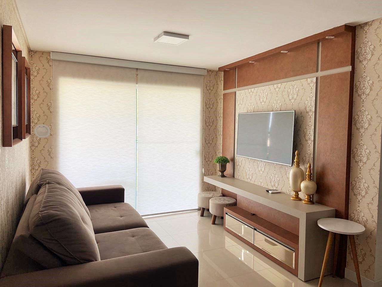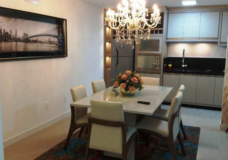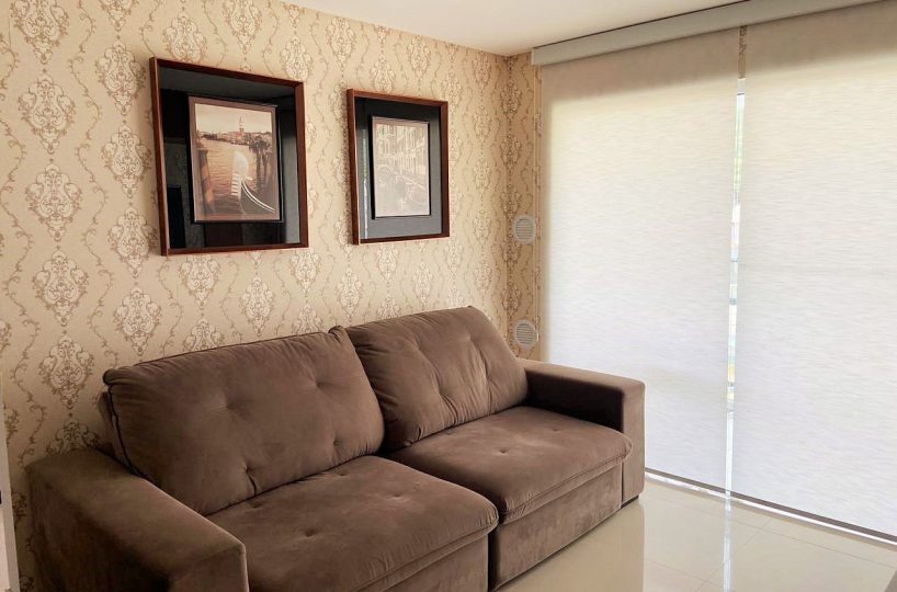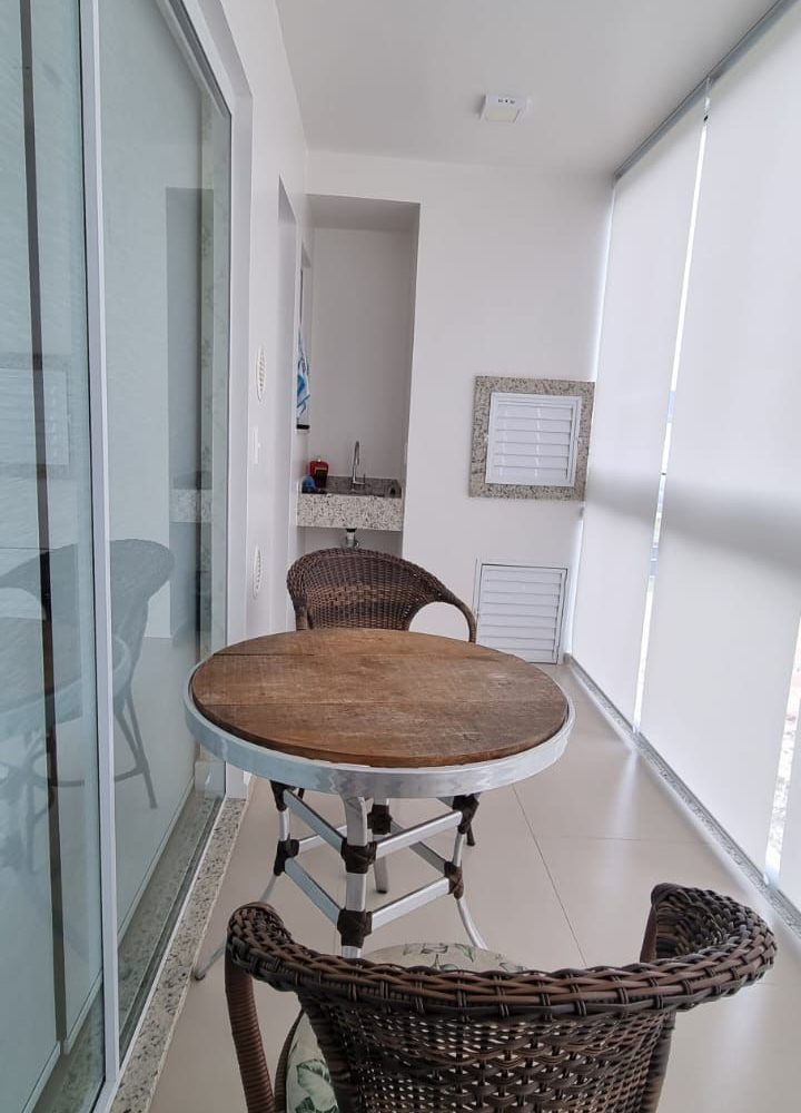 O imóvel dispõe de dois dormitórios, sendo um deles suíte, totalmente mobiliado, sala e cozinha conjugadas, banheiro social e sacada com churrasqueira a carvão .