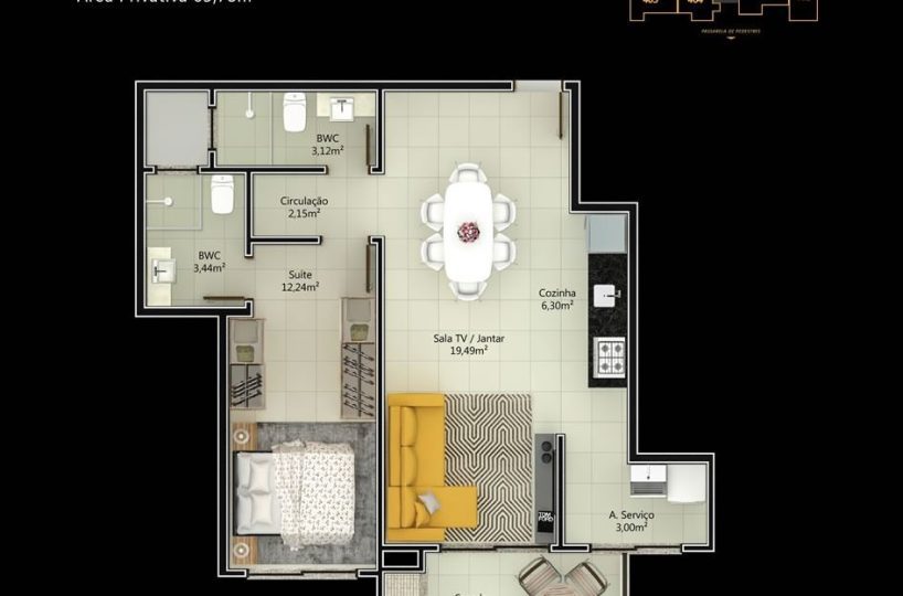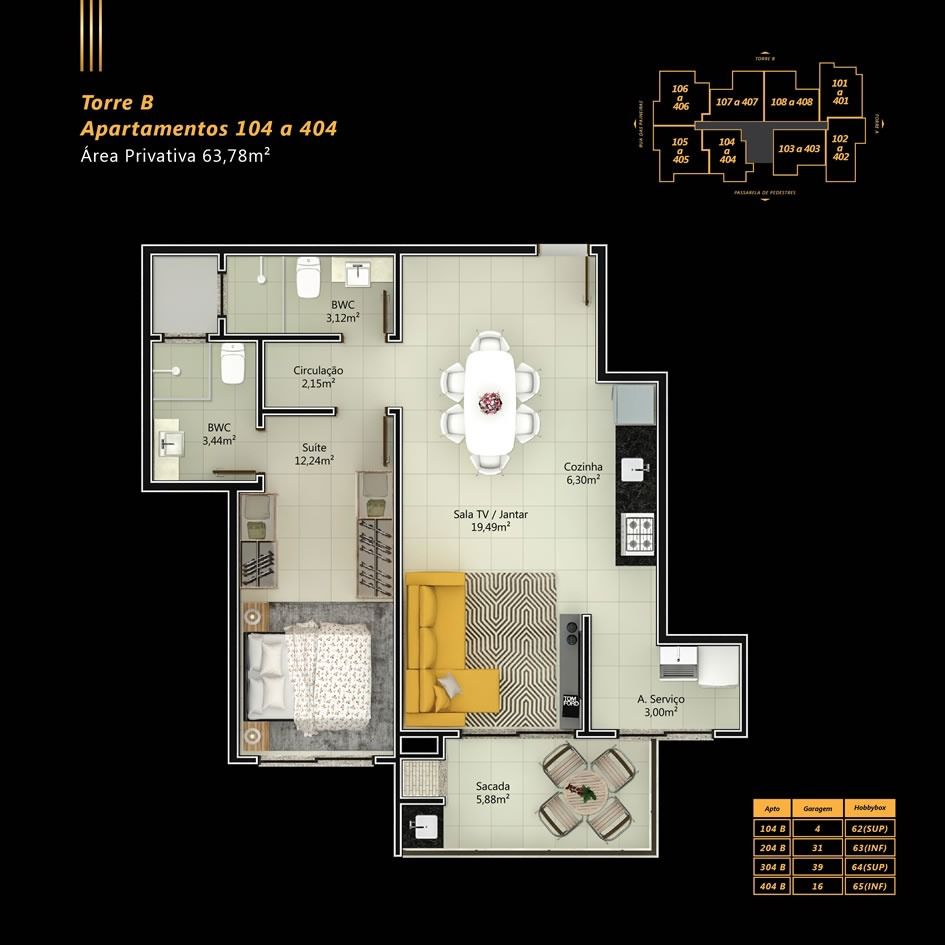 Imóvel possui área privativa 63,78m², uma vaga de garagem e um hobby box.